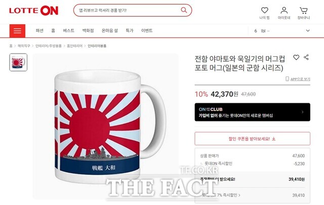 22일 <더팩트> 취재 결과 롯데온은 이날 오전 9시 40분경까지 욱일기가 그려진 머그컵을 판매하고 있었다. 해외직구 상품으로, 상품명에도 '욱일기'라고 표기돼 있었다. 그러나 취재가 시작된 뒤 얼마 되지 않아 상품 판매 중단 조치가 이뤄졌다.