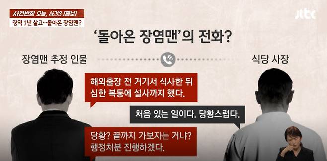 세종과 속초에 ‘배탈이 났다’며 전화를 걸어온 남성의 휴대전화 번호를 비교하니 같은 번호로 한 남성이 두 업장에 전화를 걸어 같은 내용의 통화를 한 것이 확인됐다. 이는 일명 ‘장염맨’으로 불렸던 악질적 수법과 유사했다.