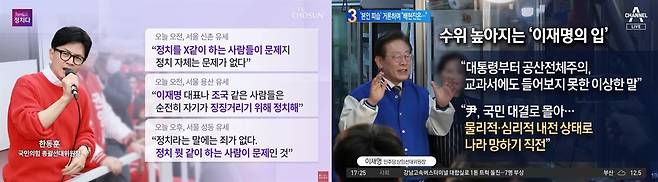 두 대표의 설화 논란를 다룬 시사대담프로그램의 보도시간과 내용을 비교해 보았습니다. TV조선·채널A·MBN 모두 한동훈 국민의힘 비대위원장의 막말은 10분 내외였던 반면, 이재명 더불어민주당 당대표의 막말은 TV조선 38분, 채널A 55분, MBN은 31분이 방송됐습니다.