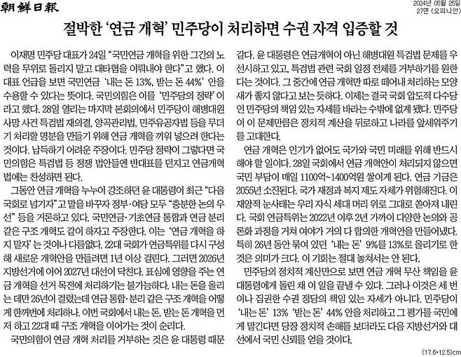 조선일보는 이어 “민주당의 정치적 계산만으로 보면 연금 개혁 무산 책임을 윤 대통령에게 돌린 채 이 일을 끝낼 수 있다. 그러나 이것은 세 번이나 집권한 수권 정당의 책임 있는 자세가 아니다”라며 “민주당이 '내는 돈' 13% '받는 돈' 44% 안을 처리하고 그 평가를 국민에게 맡긴다면 당장 정치적 손해를 보더라도 다음 지방선거와 대선에서 국민 신뢰를 얻을 것”이라고 했다.