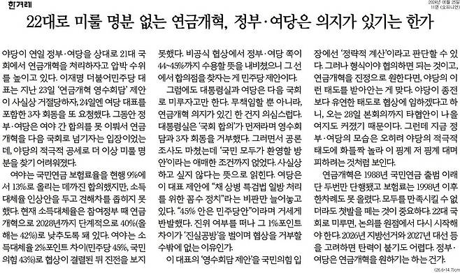 대통령실이 국민연금 개편 논의를 위한 이재명 더불어민주당 대표의 회동 제안을 거부했다. 국민의힘도 21대 국회에서 연금개혁안을 처리하자는 민주당에 정략적 의도가 있다고 반발하며 다음 국회에서 논의하겠다는 입장을 견지했다. 이에 25일 신문에선 보수·진보 관계없이 정부·여당의 태도를 “무책임하다”고 비판했다. 21대 국회의 연금개혁안 처리를 촉구하는 목소리도 이어졌다.