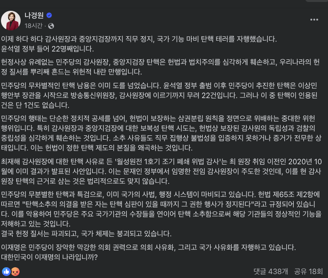 또한 "민주당이 주요 국가기관의 수장들을 연이어 탄핵 소추함으로써 해당 기관들의 정상적인 기능을 저해하고 있고, 이 때문에 결국 헌정 질서는 파괴되고, 국가 체제는 붕괴되고 있다"며 "이재명은 민주당이 장악한 막강한 의회 권력으로 의회 사유화, 그리고 국가 사유화를 자행하고 있다. 대한민국이 이재명의 나라입니까?"라고 비판했다.