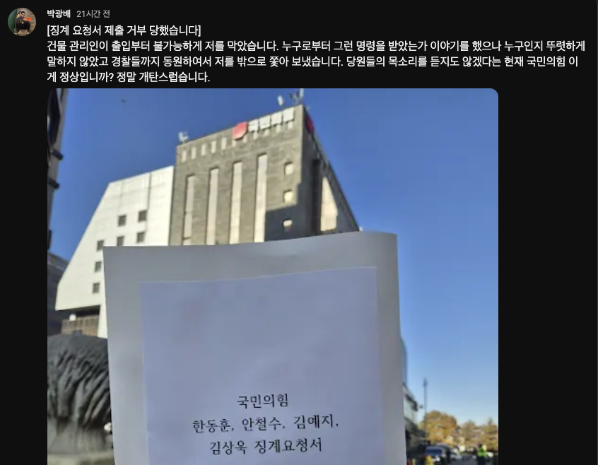 누군가가.. 국민의힘 당사에 방문해.. 탄핵소추안에 찬성이든... 반대든.. 표결을 한 국회의원에 대해 징계요청서를 낼려 했으나 못했다고 사진과 글을 올렸더군요.. 위의 보도내용에 나오는 박광배씨입니다.