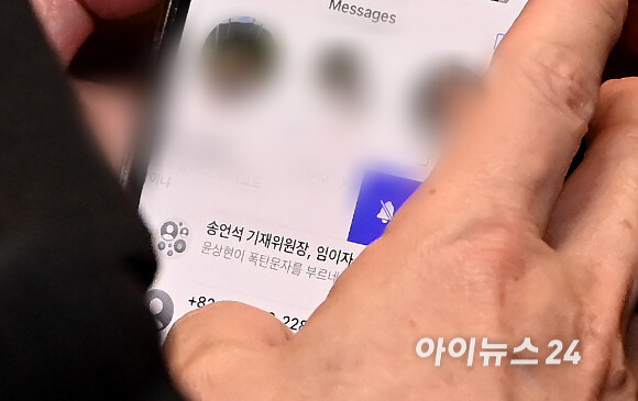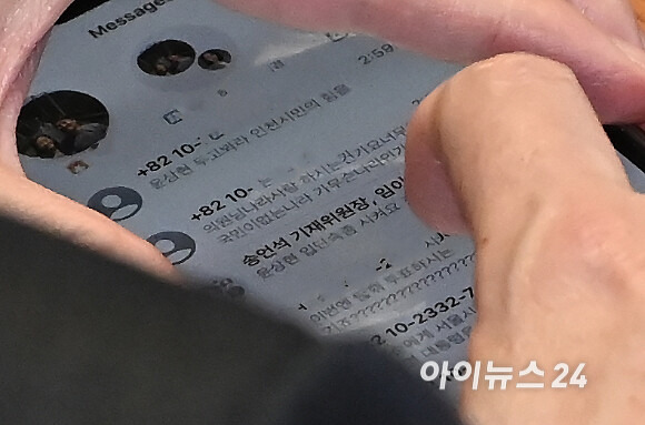 안철수 국민의힘 의원이 “윤상현 입단속 좀 시키라”는 문자메시지를 받은 모습이 11일 취재진에게 포착됐다. 발신자는 국민의힘 의원으로 추정된다.