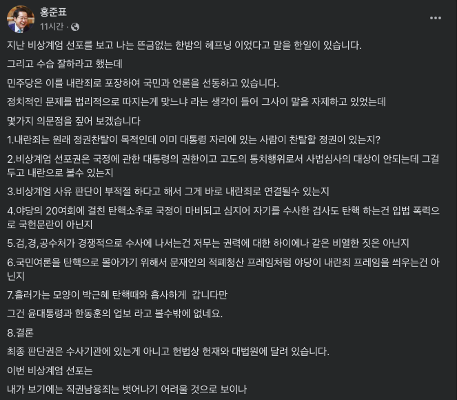 홍준표 대구시장... 뭔 생각이 들어서... 민주당이 이번 비상 계엄 사태를 내란죄로 선동한다.. 뭐 이런 글을 쓴 건가 싶더군요.
