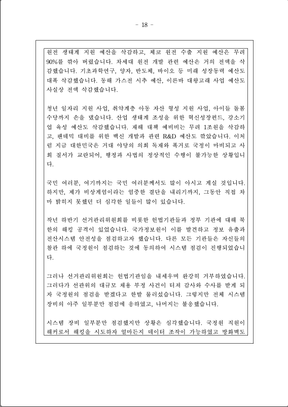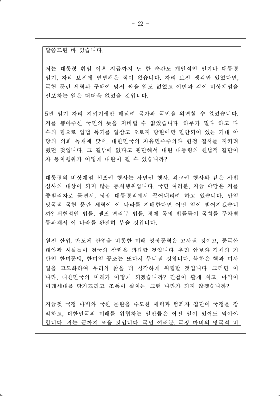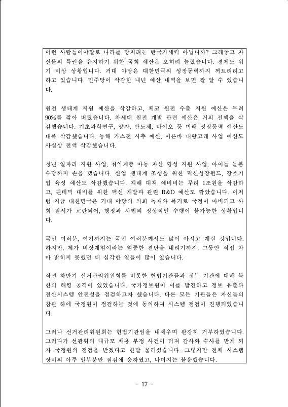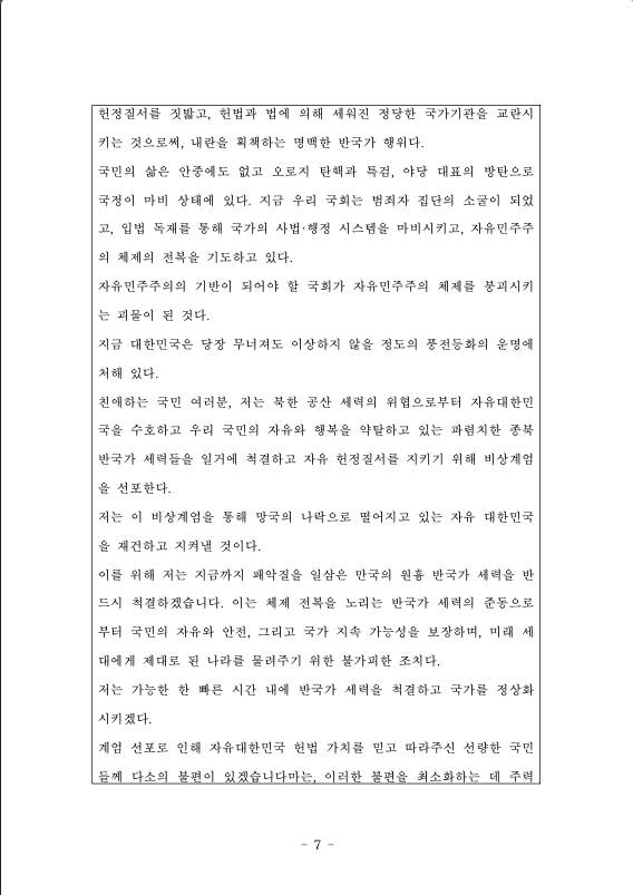 친애하는 국민 여러분, 저는 북한 공산 세력의 위협으로부터 자유대한민국을 수호하고 우리 국민의 자유와 행복을 약탈하고 있는 파렴치한 종북 반국가 세력들을 일거에 척결하고 자유 헌정질서를 지키기 위해 비상계엄을 선포한다.