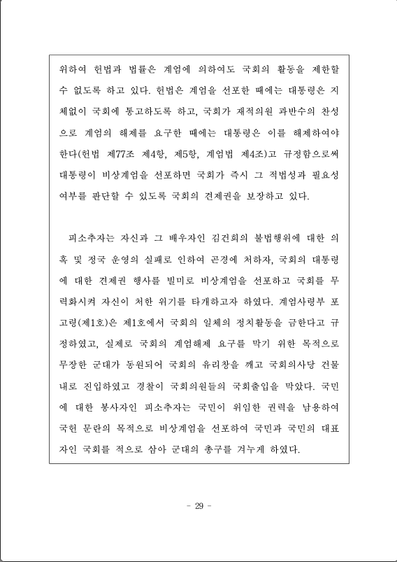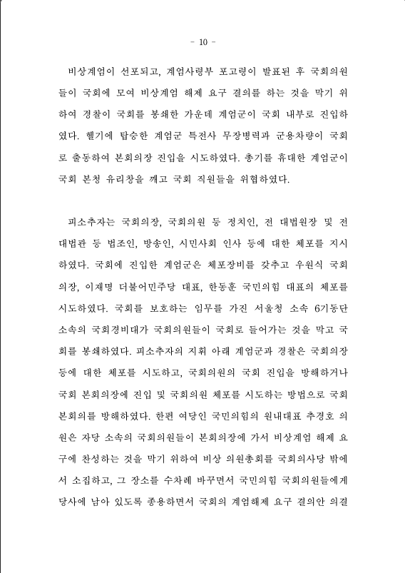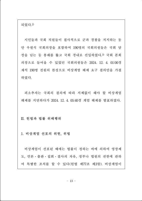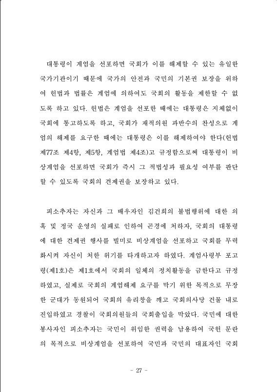 백한 반국가 행위”를 하고 “자유민주주의 체제의 전복을 기도”하는 “범죄자 집단의 소굴”, “자유민주주의 체제를 붕괴시키는 괴물”이라고 규정한 피소추자의 비상계엄 선포의 취지를 구체화하는 계엄사령부 포고령(제1호)은 “자유대한민국 내부에 암약하고 있는 반국가세력의 대한민국 체제전복 위협으로부터 자유민주주의를 수호하고, 국민의 안전을 지키기 위해” 가장 먼저 국회를 그 목표로 하였다. 국회의 “일체의 정치활동”을 금지하였고(계엄사령부 포고령(제1호) 제1호), 이를 위반한 경우에는 “계엄법 제9조(계엄사령관 특별조치권)에 의하여 영장없이 체포, 구금, 압수수색을 할 수 있으며, 계엄법 제14조(벌칙)에 의하여 처단한다”고 규정하였다(계엄사령부 포고령(제1호) 제6호).
