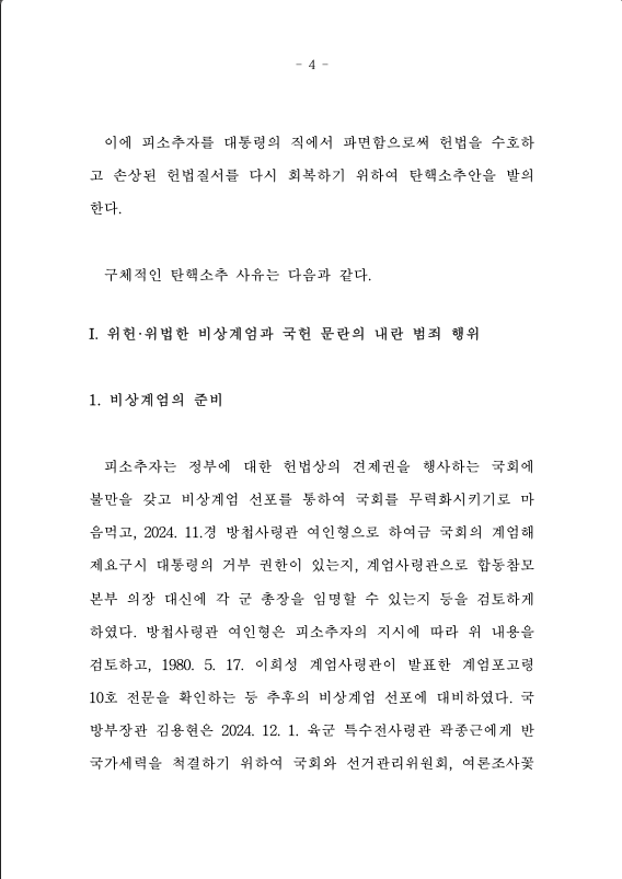 피소추자는 대한민국의 대통령인바, 2024. 12. 3. 22:30경 헌법과 법률에 위배하여 비상계엄을 선포하고 군과 경찰을 동원하여 국회를 봉쇄, 침입하여 헌법기관인 국회의 계엄해제 요구권 행사를 방해하는 등 국회의 활동을 억압하였다. 헌법기관인 중앙선거관리위원회를 위법하게 침입하였을 뿐만 아니라, 국회의원, 정치인, 언론인 등의 불법체포를 시도하였다. 피소추자는 국헌을 문란할 목적으로 그 요건과 절차를 위반하여 비상계엄을 선포하고 무장한 군과 경찰을 동원하여 국회를 침입하는 등 국회와 국민을 협박하고 폭행하는 일련의 폭동을 일으킴으로써 대한민국 전역의 평온을 해하는 내란죄를 범하였다.