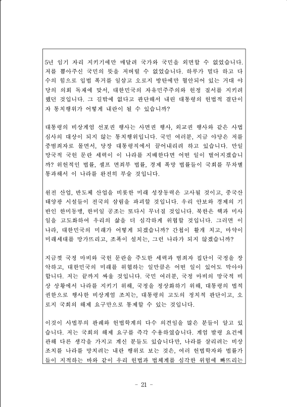 지금 우리 국회는 범죄자 집단의 소굴이 되었고, 입법 독재를 통해 국가의 사법·행정 시스템을 마비시키고, 자유민주주의 체제의 전복을 기도하고 있다. 자유민주주의의 기반이 되어야 할 국회가 자유민주주의 체제를 붕괴시키 는 괴물이 된 것다.