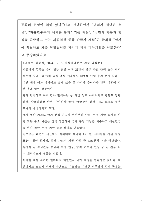 피소추자는 국민이 만든 여소야대 국회의 탄핵소추안 발의, 주요 정부예산 삭감 등 대통령에 대한 헌법상의 견제권 행사를 “내란을 획책하는 명백한 반국가 행위”이며 “자유민주주의 체제의 전복을 기도”하는 것이라고 규정하면서, 이로 인하여 대한민국의 “국정이 마비”되고, “당장 무너져도 이상하지 않을 정도의 풍전등화의 운명에 처해 있다.”다고 진단하면서 “범죄자 집단의 소굴”, “자유민주주의 체제를 붕괴시키는 괴물”, “국민의 자유와 행복을 약탈하고 있는 파렴치한 종북 반국가 세력”인 국회를 “일거에 척결하고 자유 헌정질서를 지키기 위해 비상계엄을 선포한다” 고 주장하였다.