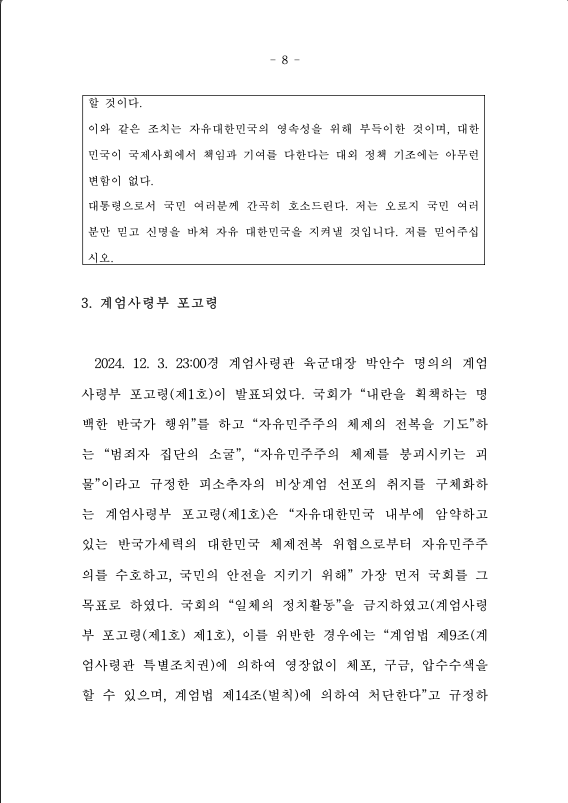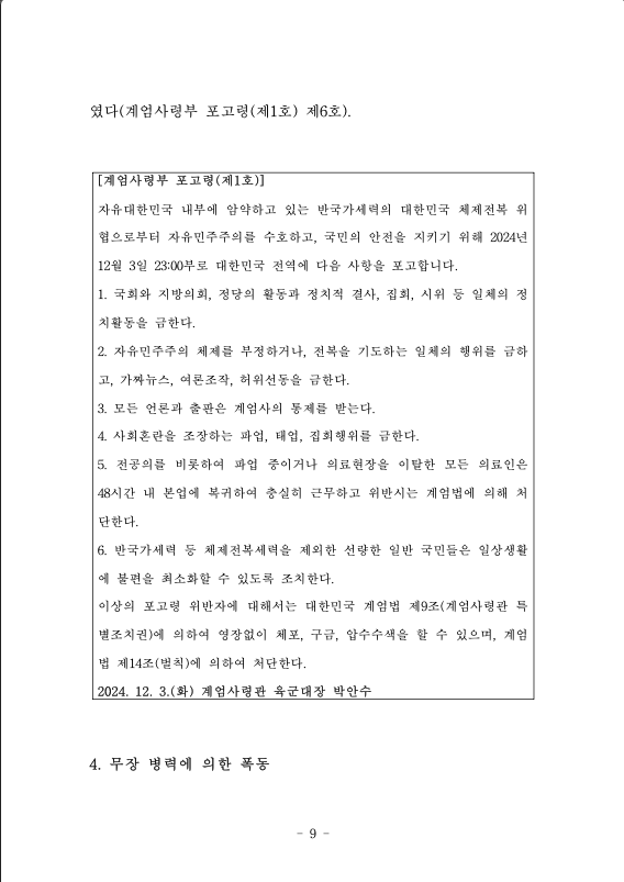 자유대한민국 내부에 암약하고 있는 반국가세력의 대한민국 체제전복 위 협으로부터 자유민주주의를 수호하고, 국민의 안전을 지키기 위해 2024년 12월 3일 23:00부로 대한민국 전역에 다음 사항을 포고합니다.