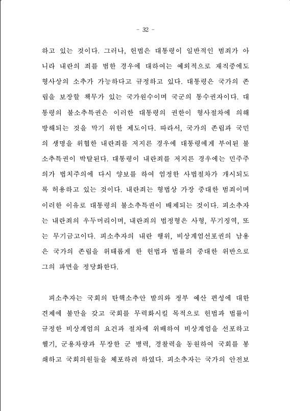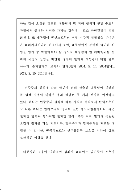 민주주의 원칙에 따라 국민에 의해 선출된 대통령이 내란죄를 범한 경우에 대하여 우리 헌법은 두 개의 절차를 예정하고 있다. 하나는 민주주의 원칙에 따른 정치적 절차로서 탄핵소추이고 다른 하나는 법치주의의 영역에 있는 형사사법절차이다. 파면절차인 탄핵과 형사처벌 절차인 형사소추는 각각 별개의 독립된 요건과 절차를 가진 제도이다. 민주주의와 법치주의는 때로는 대립할 수 있지만, 궁극적으로는 민주공화국 보호를 위하여 상호 보완적인 역할을 한다.