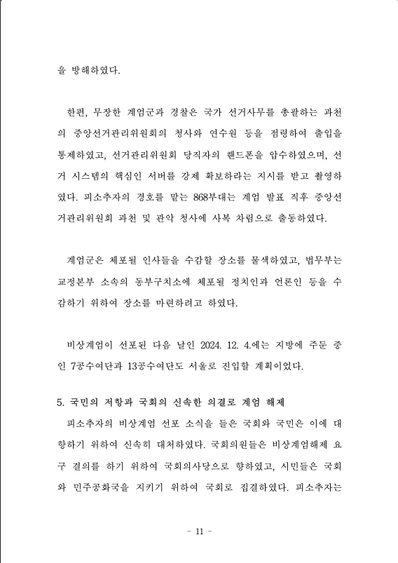 피소추자는 자신이 처한 어려움을 모두 국회의 탓으로 돌리고, 국회가 자유민주주의 체제의 전복을 기도하고 있다고 주장하면서 자신을 추종하는 일부 고위직 세력과 공모하여 2024. 12. 3. 밤에 비상계엄을 선포하고 군경을 동원하여 친위 쿠데타를 감행하는 내란죄를 저질렀다. 헬기와 군용차량, 무장 병력이 동원된 쿠데타를 막고 국회를 보호하기 위하여 수 많은 시민들이 국회로 향하였다. 국회에 집결한 시민들과 국회 직원들이 계엄군, 경찰과 대치하는 가운데 국회가 계엄해제 요구를 결의하였고, 피소추자는 이에 따라 비상계엄을 해제하였다. 시민들의 희생과 노력이 쿠데타를 막고 민주주의를 지켜냈으며, 성숙한 시민의식으로 내란 폭동의 심각한 위기를 큰 유혈사태 없이 넘길 수 있었다.