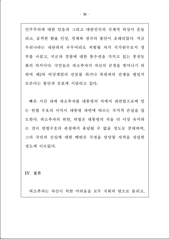 빠른 시간 내에 피소추자를 대통령의 직에서 파면함으로써 얻는 헌법 수호의 이익이 대통령 파면에 따르는 국가적 손실을 압도한다. 피소추자의 위헌, 위법은 대통령의 직을 더 이상 유지하는 것이 헌법수호의 관점에서 용납될 수 없을 정도로 중대하며, 그의 국민의 신임에 대한 배반은 국정을 담당할 자격을 상실한 정도에 이르렀다.