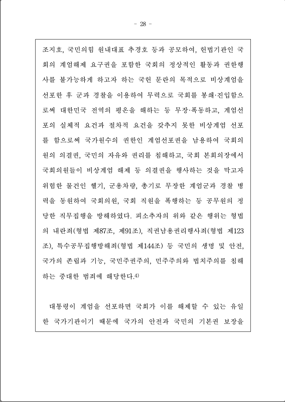 선포한 후 군과 경찰을 이용하여 무력으로 국회를 봉쇄·진입함으로써 대한민국 전역의 평온을 해하는 등 무장·폭동하고, 계엄선포의 실체적 요건과 절차적 요건을 갖추지 못한 비상계엄 선포를 함으로써 국가원수의 권한인 계엄선포권을 남용하여 국회의원의 의결권, 국민의 자유와 권리를 침해하고, 국회 본회의장에서 국회의원들이 비상계엄 해제 등 의결권을 행사하는 것을 막고자 위험한 물건인 헬기, 군용차량, 총기로 무장한 계엄군과 경찰 병력을 동원하여 국회의원, 국회 직원을 폭행하는 등 공무원의 정당한 직무집행을 방해하였다. 피소추자의 위와 같은 행위는 형법의 내란죄(형법 제87조, 제91조), 직권남용권리행사죄(형법 제123조), 특수공무집행방해죄(형법 제144조) 등 국민의 생명 및 안전, 국가의 존립과 기능, 국민주권주의, 민주주의와 법치주의를 침해하는 중대한 범죄에 해당한다.