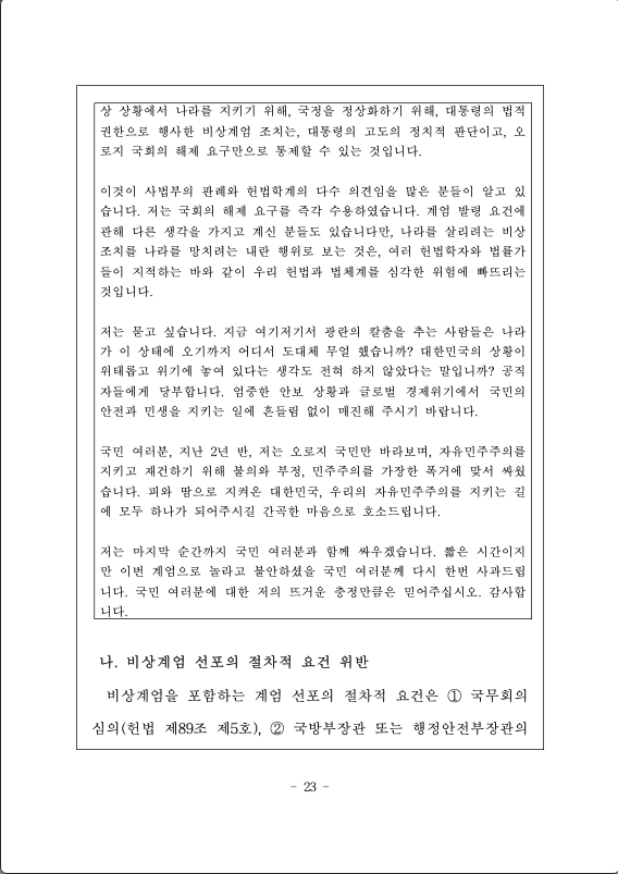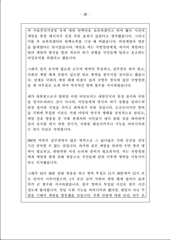 존경하는 국민 여러분, 저는 오늘, 비상계엄에 관한 입장을 밝히기 위해 이 자리에 섰습니다.