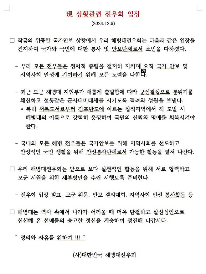전우회는 지난 9일 '현 상황 관련 전우회 입장'이라는 제목의 글에서 "작금의 위중한 국가안보 상황에서 모든 전우들은 정치적 중립을 철저히 지키며 오직 국가안보 및 지역사회 안정에 기여하기 위해 모든 노력을 다해야 한다"고 밝혔다.