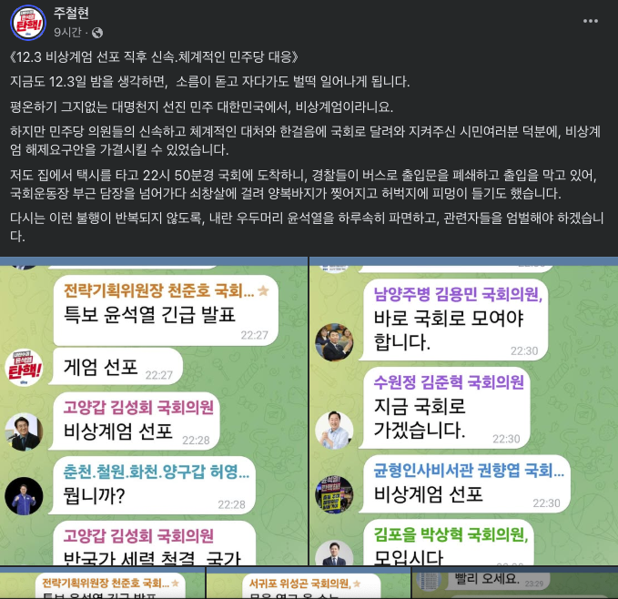 천준호 의원은 3일 오후 10시 26분 “특보 윤석열 긴급 발표, 계엄선포”라는 첫 메시지를 올렸다. 이어 김윤덕 의원은 “비상상황 입니다”라고 강조했다. 천 의원이 “보좌진도 다 국회로 모여야 합니다”라고 말하자, 이 대표는 “국회로”라는 짧은 메시지를 전송했다.
