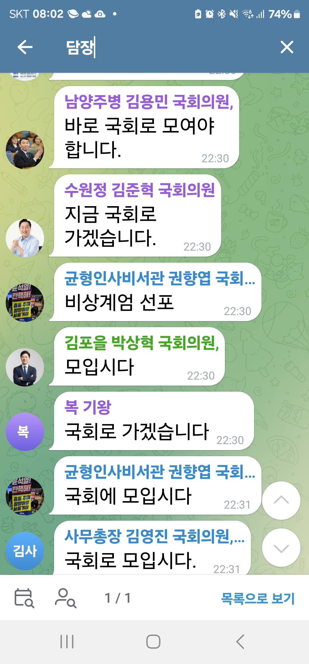 우왕자왕하던 국민의힘의 단톡방과는 다르게.. 별다른 고민 없이 국회로... 국회 본회의장으로 가자는 내용이 다수입니다. 어디가 막히고.. 어디가 가능하고.. 그런 정보공유도 있지만.. 결국 일관되게 국회로 와야 한다는 내용이 다수라는걸 알 수 있습니다.