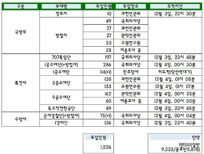 23일 허영 더불어민주당 의원은 비상계엄 사태 이후 육군특수전사령부, 수도방위사령부, 국군방첩사령부, 정보사령부 등으로부터 제출받은 계엄군 투입현황을 집계한 결과, 군 스스로 밝힌 투입 인원이 1526명에 달했다고 밝혔다. 특전사가 707특임단, 1·3·9공수와 특수작전항공단까지 포함해서 모두 1139명으로 가장 많았고, 수방사가 211명, 방첩사가 166명, 정보사가 10명이라고 각각 제출한 상태다.