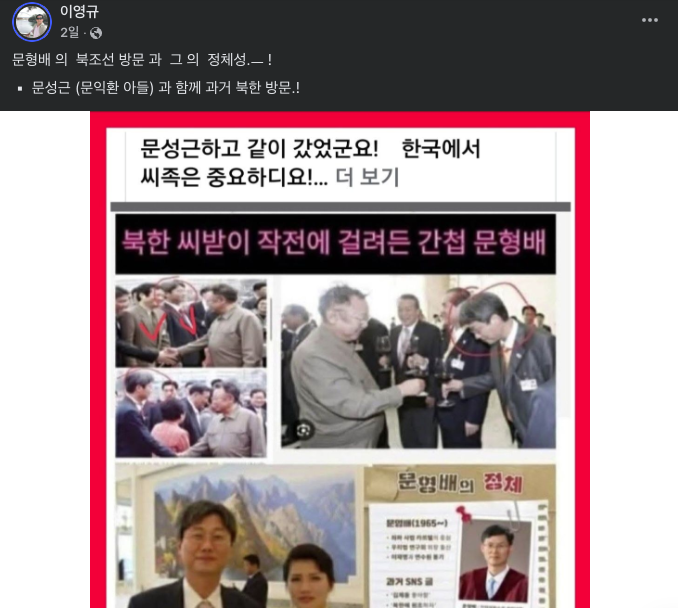 북한학자이기도 한 그가 과거 남북정상회담 특별수행원으로 평양을 방문했을 때 모습을 두고, 마치 문형배 헌법재판소장 권한대행인 것처럼 허위로 왜곡해 비난한 문구가 적힌 겁니다.