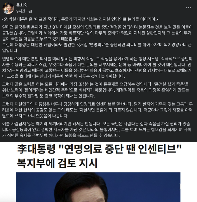 윤희숙 전 국민의힘 의원이 이재명 대통령이 보건복지부에 연명치료 중단 권장안을 지시한 데 대해 “경박한 대통령은 ‘아프면 죽어라, 돈줄게’라지만 사회는 진지한 연명의료 논의를 이어가야한다”고 비판했다.