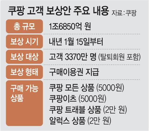 이날 쿠팡은 보도자료를 통해 개인정보 유출 사태에 대한 보상안을 마련했다고 밝혔다. 보상 대상은 지난달 개인정보 유출 통지를 받은 3370만개 계정의 고객으로, 와우회원·일반회원 모두 같은 규모로 지급한다. 개인정보 유출 통지를 받은 뒤 쿠팡을 탈퇴한 고객도 포함된다.