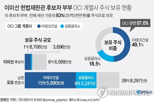 이 후보자 부부는 OCI그룹 계열사 이테크건설 주식을 17억4천596만원(전체 주식의 49.1%), 마찬가지로 OCI그룹 계열사인 삼광글라스 주식을 6억5천937만원(전체 주식의 18.5%) 보유하고 있다. 이들 업체의 주식을 합하면 전체 주식의 67.6%에 달하는 셈이다.