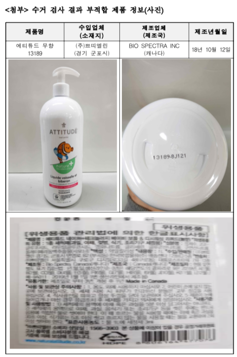 이번에 CMIT·MIT가 검출된 제품은 쁘띠엘린이 수입한 캐나다 주방 세제 브랜드 에티튜드 2종인 '에티튜드무향 13189', '에티튜드무향 13179' 와 대성씨앤에스가 벨기에에서 수입한 '엔지폼 PRO', 에이비인터네셔날이 중국에서 수입한 '스칸팬 세척제'다. 이 가운데 국내에 유통된 제품은 '에티튜드무향13189'로 나머지는 통관 단계에서 금지됐다.
