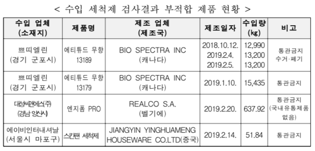 식품의약품안전처는 17일 유아용품 제조업체 쁘띠엘린이 수입한 위생용품 세척제 2종과 대성씨앤에스, 에이비인터내셔날이 수입한 세척제 2종에서 살균보존제인 '메칠클로로이소치아졸리논/메칠이소치아졸리논'(CMIT/MIT)이 검출돼 해당 제품의 통관을 금지하고, 회수·폐기한다고 밝혔다.