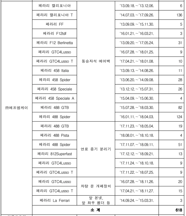'페라리 488GTB(F142BBE)' 등 6개 차종 105대에서는 연료증기 분리기 플라스틱 결합 부위에 균열이 생겨 화재가 발생할 수 있다는 가능성이 제기됐으며, '페라리 GTC4Lusso' 2개 차종 35대에서는 외부에서 문이 열리지 않을 가능성이 제기됐다.