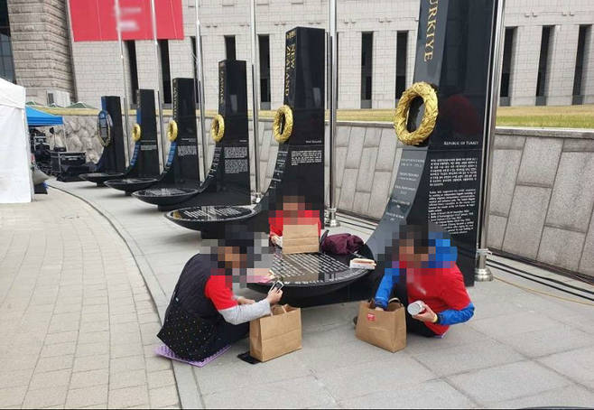 지난 21일 전쟁기념관 홈페이지 고객의 소리 게시판에 “전쟁기념관 관리 참담하네요”라는 제목의 글과 함께 몇몇 사람들이 6·25전쟁 참전국 기념비에서 식사하는 모습이 찍힌 사진을 공개했다.