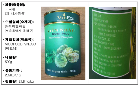 열대과일 노니를 가공하여 판매하는 제품에 쇳가루가 검출되어 판매가 중단되었습니다.