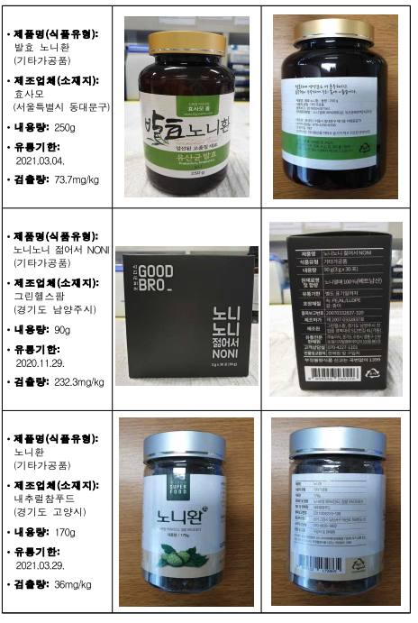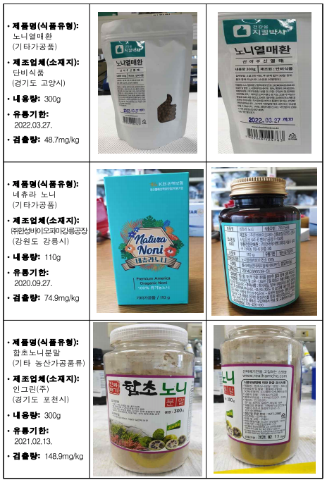 1일 식품의약품안전처는 인터넷에서 유통·판매되고 있는 노니 분말·환 88개 제품을 수거해 세균수·대장균·금속성 이물질 등 검사를 한 결과 22개 제품에서 기준치(10㎎/㎏)가 넘는 쇳가루가 나왔다고 밝혔다. 문제가 된 제품은 ‘광동 노니파우더', ‘더조은 노니 파우더', ‘내몸엔 노니 분말', ‘아임더 닥터 노니' 등이며 이러한 제품에 대해선 판매중단 및 회수 조치를 했다고 식약처는 전했다.
