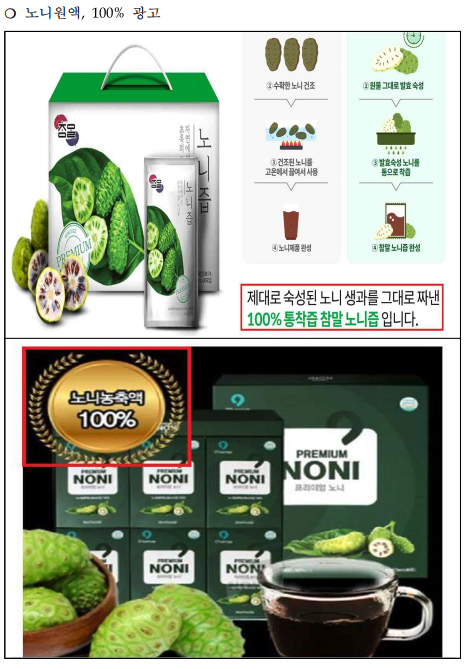 또 인터넷 쇼핑몰 등을 점검한 결과 196개 사이트에서 판매되고 있던 65개 제품은 ‘질병 예방이나 치료 효능’을 내세우는 등 허위·과대광고를 하고 있었다. 현재 노니를 가공해 만든 제품은 법률로 관리되고 있는 건강기능식품이 아닌 일반식품이다. 식약처 위해사범중앙조사단 신용주 서기관은 “건강기능식품의 경우 하루 어느 정도 먹어야 건강 증진에 도움이 되는지 그 함량이 정해져있다. 노니 과일이나 주스가 건강에 이로울 순 있으나 얼마나 먹어야 건강 증진 효과가 있는지 객관적으로 검증이 되지 않았다. 그러므로 염증을 없앤다거나 항암 치료에 효과적이라는 문구는 허위·과대광고”라고 설명했다. 또 노니 가공 제품에서 유독 쇳가루가 자주 검출되는 데 대해 “대체로 땅에 떨어진 농산물을 가공처리 하는데 그 과정에서 가열 등으로 미생물 살균 처리가 되지만 쇳가루는 침전이 된다. 이를 자석으로 걸러야 하는데 이러한 공정이 소홀히 이뤄진 것”이라고 덧붙였다.