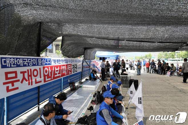 17일 경찰, 서울시, 대한애국당에 따르면 이날 오전 6시20분쯤 대한애국당 관계자 28명이 광장에 천막 1동을 추가로 설치하려다 이를 막는 서울시 공무원과 마찰을 빚은 것으로 나타났다.