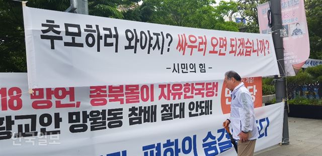 그러나 광주시민들은 이들에게 냉소를 쏟아내면서도 의연하게 대처해 충돌을 피했다. 주모(51)씨는 “5월 영령들의 넋을 추모하는 날에 부산갈매기 노래를 부른다는 게 있을 수 있는 일이냐”며 “마치 지역감정을 유발하려는 듯한 저들의 망동에 광주시민들이 흥분하지 않고 성숙한 시민의식을 보여주며 ‘손님’들을 맞이한 게 자랑스럽다”고 말했다. 이날 보수단체 회원들의 5ㆍ18 폄훼 집회가 열린 금남공원 한쪽에 한 시민이 내걸어 놓은 플래카드엔 ‘추모하러 와야지? 싸우러 오면 되겠습니까?’라는 글귀가 적혀 있었다.