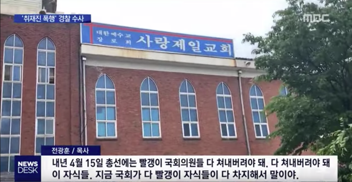 이 과정에서 카메라기자가 전치 2주의 부상을 입었고 교회 관계자들은 출동한 경찰관 앞에서 카메라마저 부숴버렸습니다.