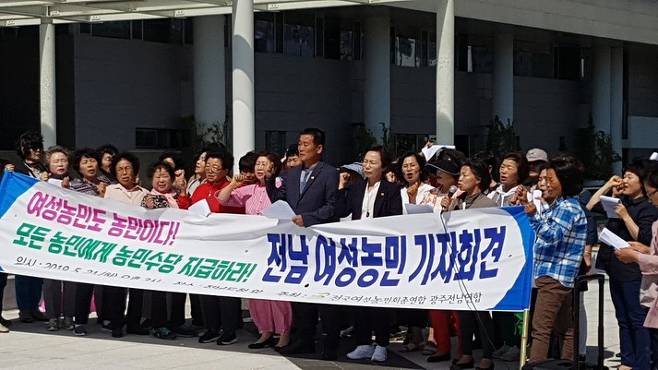 전국여성농민회총연합 광주전남연합은 21일 전남도청에서 기자회견을 열고 “여성농민도 농민이다. 모든 농민에게 농민수당을 지급하라”고 촉구했다. 전남도가 내년부터 시행할 농민수당의 지급대상을 농민(30만6000여명)이 아니라 농가(14만5000가구)나 농업경영체(21만9000여명)로 제한하려는 데 대한 반발이다.