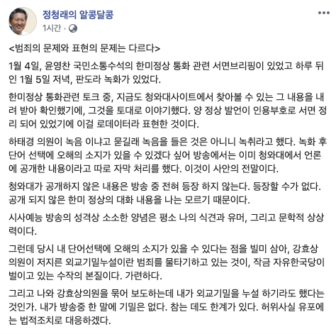 이후 정청래의원이 페이스북을 통해 입장을 밝혔습니다.