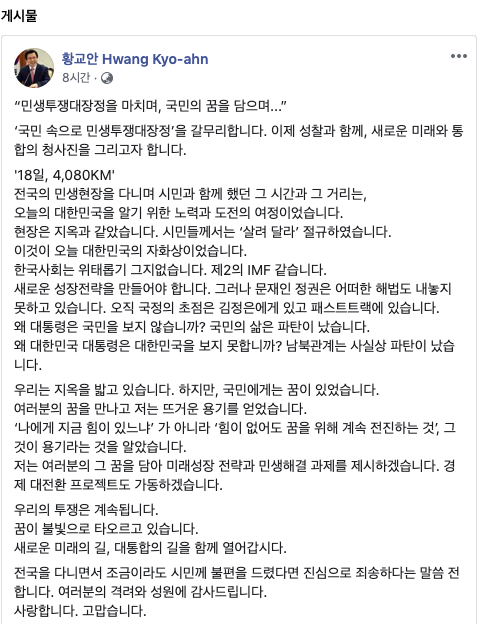 황 대표는 이날 자신의 페이스북에 지난 18일간 '민생투쟁대장정' 결과 "현장은 지옥 같았고 시민들은 '살려 달라' 절규했다"며 "한국사회는 위태롭기 그지없고 제2의 IMF 같았다"고 비판했다.