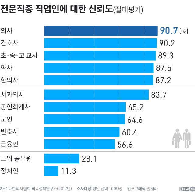 신뢰할 수 밖에 없는 것이 의사이외엔 할 수 있는 직종이 없고 의사가 아니라면 생명을 잃기도 하기 때문입니다..