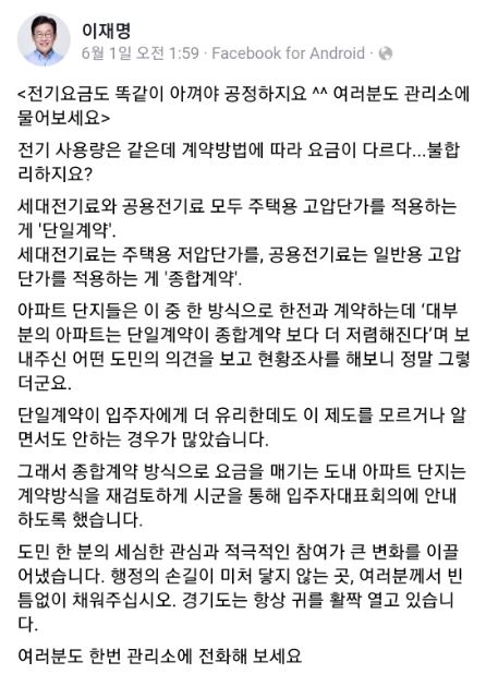 이재명 경기지사가 지난 1일 자신의 사회관계망서비스(SNS)에 올린 글 내용 중 일부다. 이 지사는 SNS에 “아파트 단지들은 ‘단일계약’과 ‘종합계약’ 중 한 방식으로 한전과 계약하는데 단일계약이 종합계약보다 더 저렴하다는 제보가 있어 확인해 보니 정말 그렇다”고 글을 올렸다. 그러면서 “단일계약이 입주자에게 더 유리한데도 이 제도를 모르는 경우가 있는 것 같다”며 “계약방식을 재검토해 보시고, 관리사무소에 물어보세요”라고 적었다.