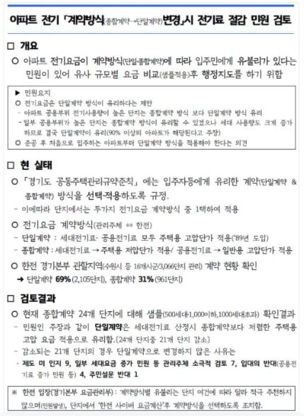 4일 도에 따르면 통상 일반 아파트 단지는 전기요금 관련, 한전과 계약을 체결하면서 ‘단일계약’과 ‘종합계약’ 등 두 가지 중 한 가지를 선택해야 한다. ‘단일계약’은 승강기와 주차장, 관리사무소 등 공용시설 전기료와 가구별 전기료를 합산해 계산하는 방식이다. 이때 전기료는 가구와 공용 모두 ‘주택용 고압요금제’가 적용된다. ‘종합계약’은 이들을 분리해 계산하는 방식이며, 가구는 ‘주택용 저압요금제’가, 공용시설은 ‘일반용 고압요금제’가 각각 적용된다.