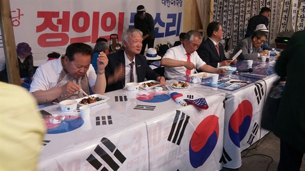 논란은 사진 한 장에서 시작됐다. 대한애국당은 지난 8일 서울역과 광화문광장에서 제127차 태극기 집회를 개최했다. 당시 조원진 대표, 박태우 사무총장, 서석구 변호사, 허평환 전 기무사령관 등은 광화문 천막 농성장에서 도시락으로 한 끼를 해결했다.