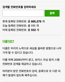 더콜은 2009년부터 광고, 보이스 피싱 등의 스팸 전화번호 검색을 제공하고 있습니다.