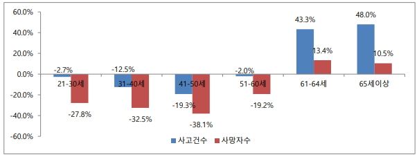 청장년 연령대에서 교통사고 수와 사망자 수가 감소한 반면, 65세 이상 운전자의 교통사고 수는 48%, 사망자 수는 10.5% 증가했다. 도로교통공단은 고령 운전자가 시력이 감소하고 반응 시간이 늦어지며 속도와 거리 판단에 능력 저하가 나타나기 때문에 사고 발생 가능성이 높아진다고 분석한 바 있다.