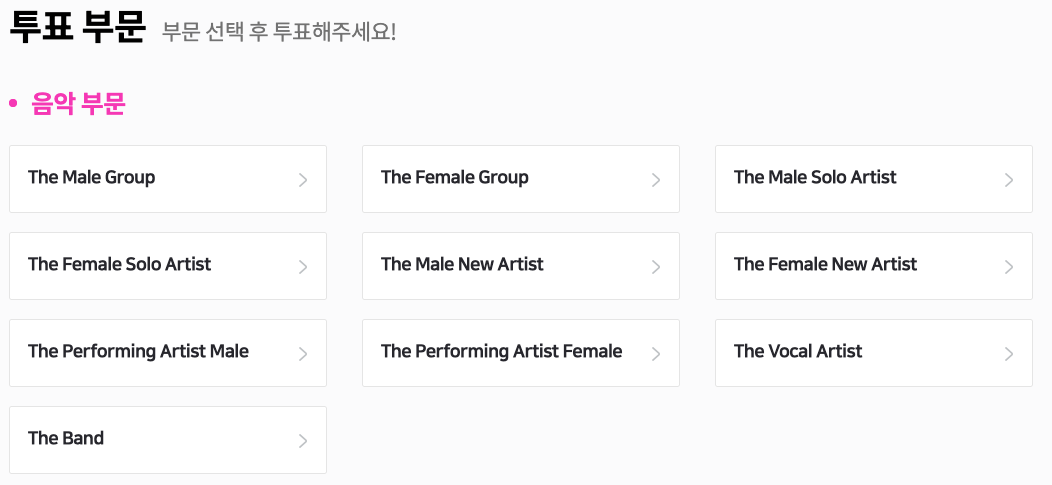 음악 부문에는 남·여 그룹, 남·여 솔로 아티스트, 남·여 신인상, 남·여 퍼포밍 아티스트, 보컬, 밴드 등 10개 시상이 있다.