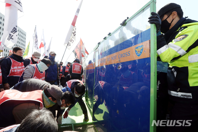 민주노총은 허가받지 않은 국회 진입을 시도하였으나 경찰에 의해 저지당했습니다.