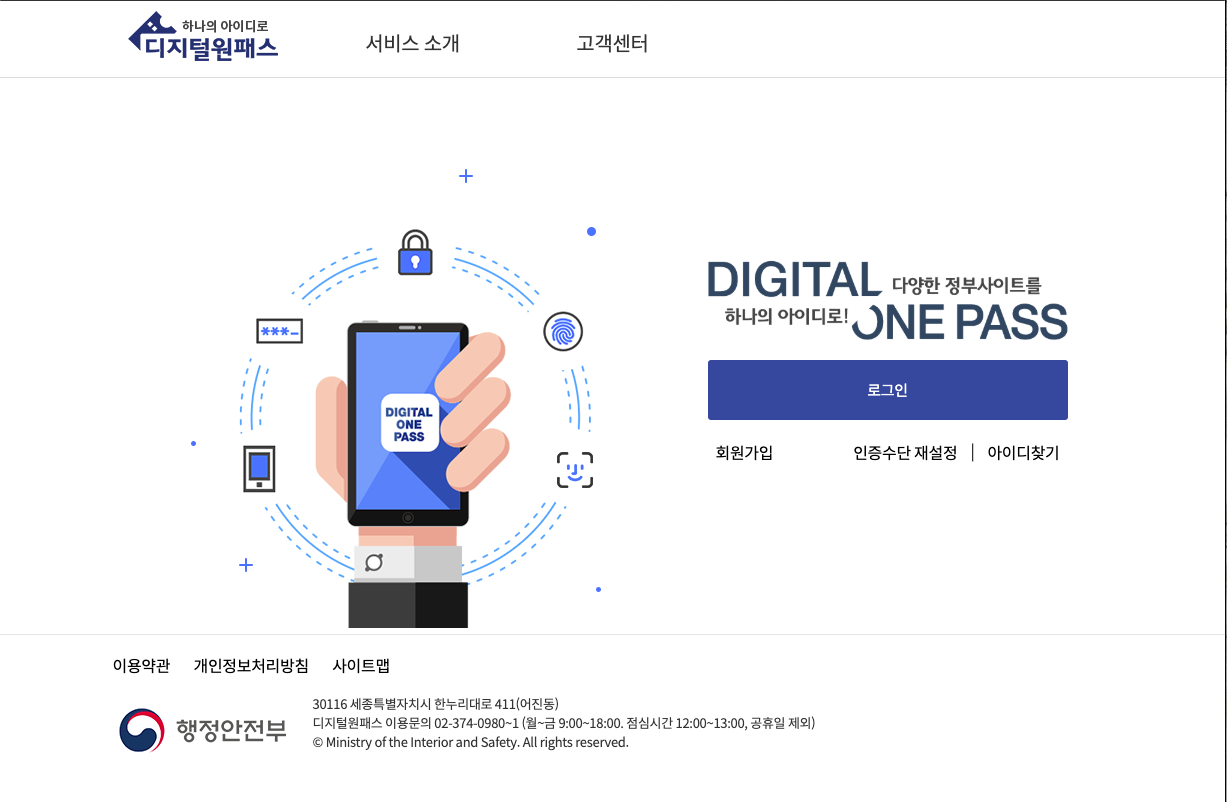 * 서비스 안내 하나의 아이디로 본인이 선택한 인증수단을 사용하여 안전하고 편리하게 여러 전자정부 서비스를 이용할 수 있는 인증 서비스입니다. 전자정부 서비스 이용 시 웹사이트마다 아이디를 일일이 기억할 필요 없이 하나의 디지털원패스 아이디를 통해 여러 전자정부 서비스들을 이용할 수 있습니다. 디지털원패스에서는 편리하게 전자정부 서비스를 이용할 수 있도록 생체(지문, 안면), 모바일 핀/패턴, 문자메세지, 공인인증서(PC, 모바일) 등 다양한 간편 인증